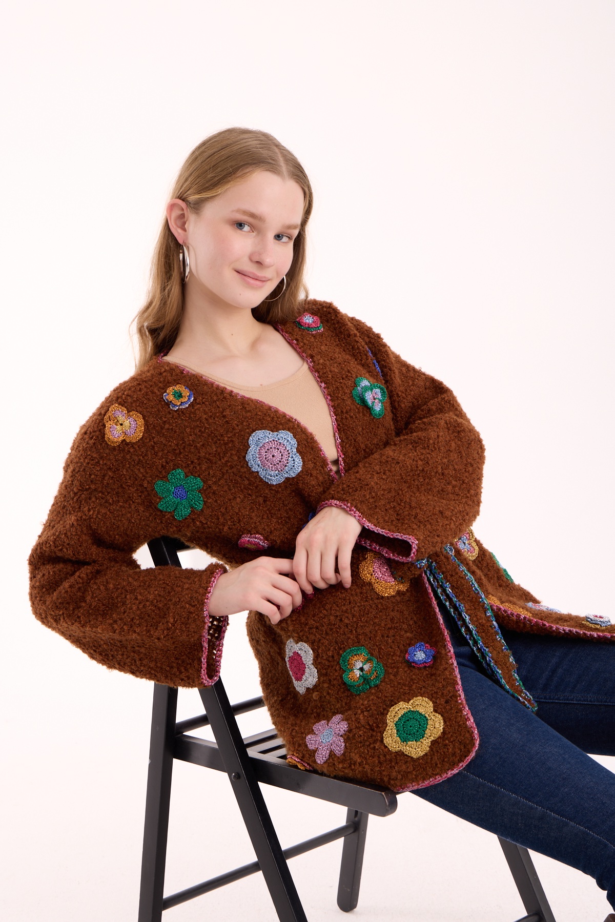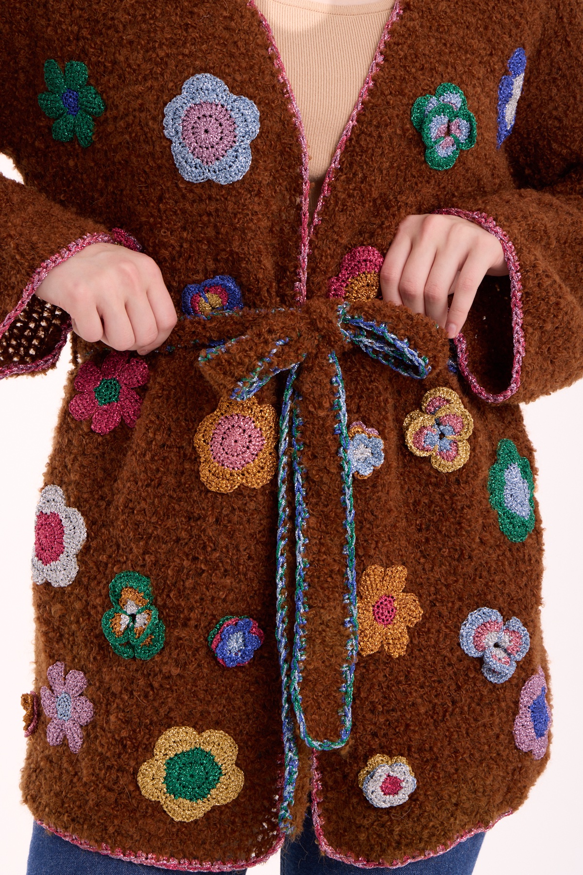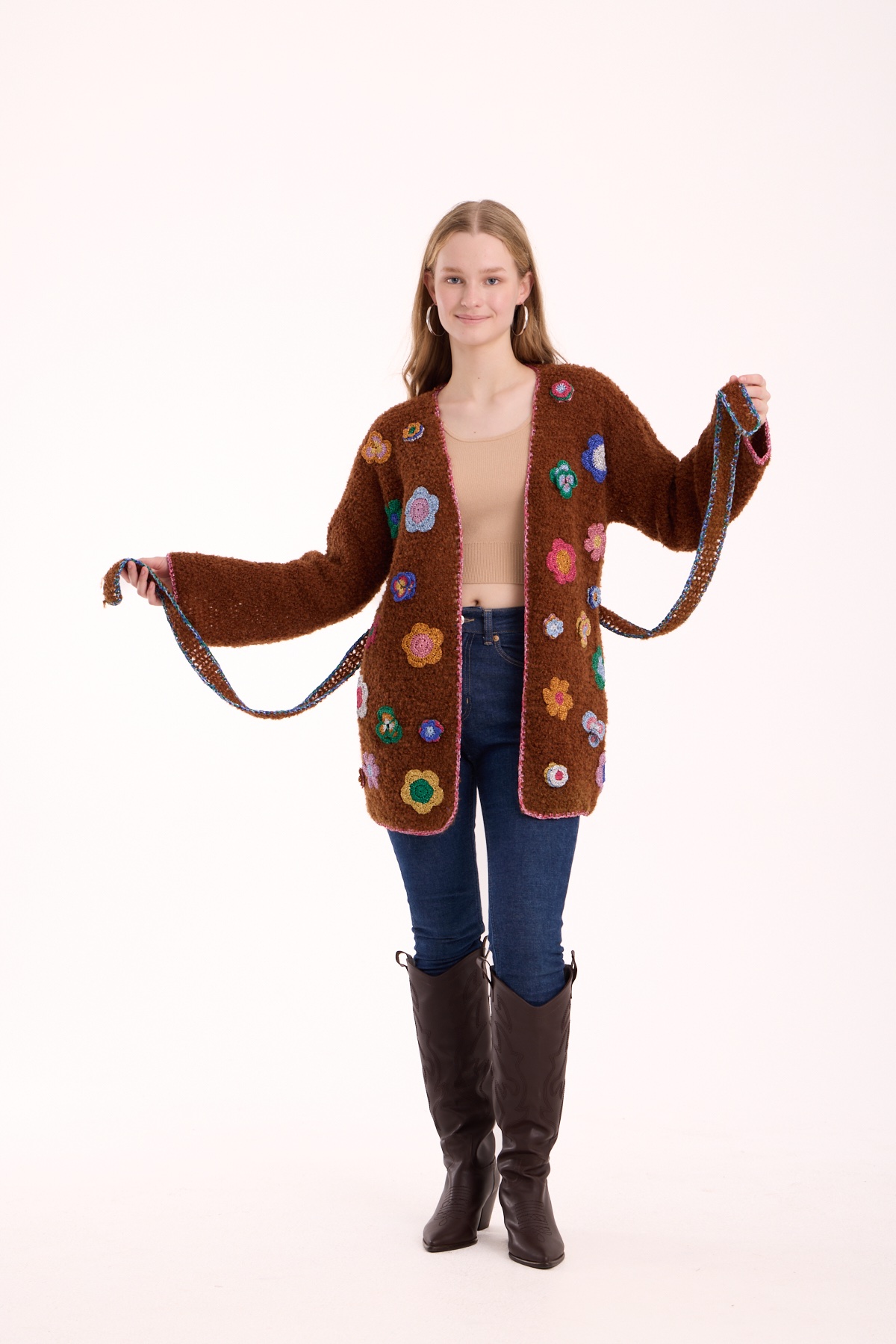 Simli iplerle titizlikle işlenen rengarenk çiçek desenleri, bu kimono hırkayı sıradanlıktan uzaklaştırıp, gerçek bir sanat eserine dönüştürüyor. Her bir çiçek özenle tığ işi ile hırkaya işlenmiş ve hırkaya canlı bir dokunuş katmış.