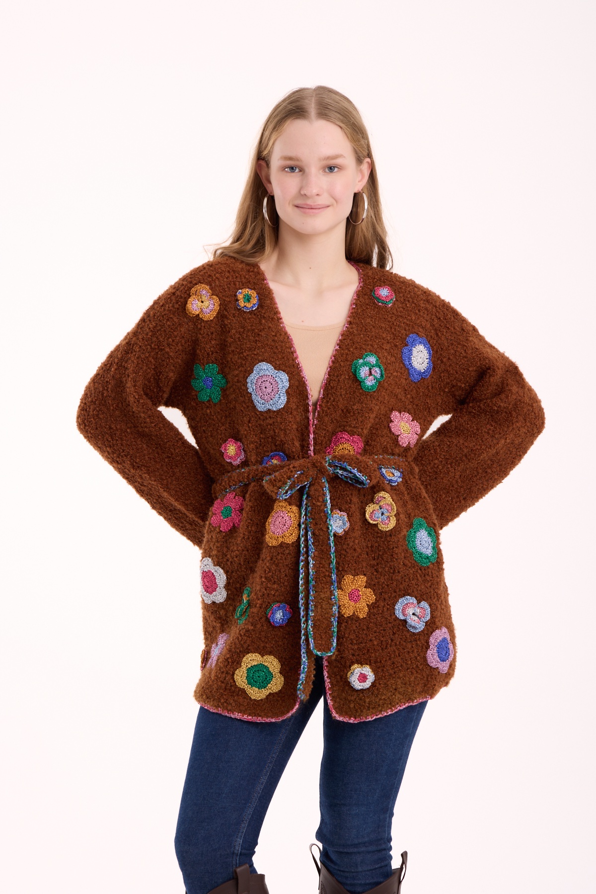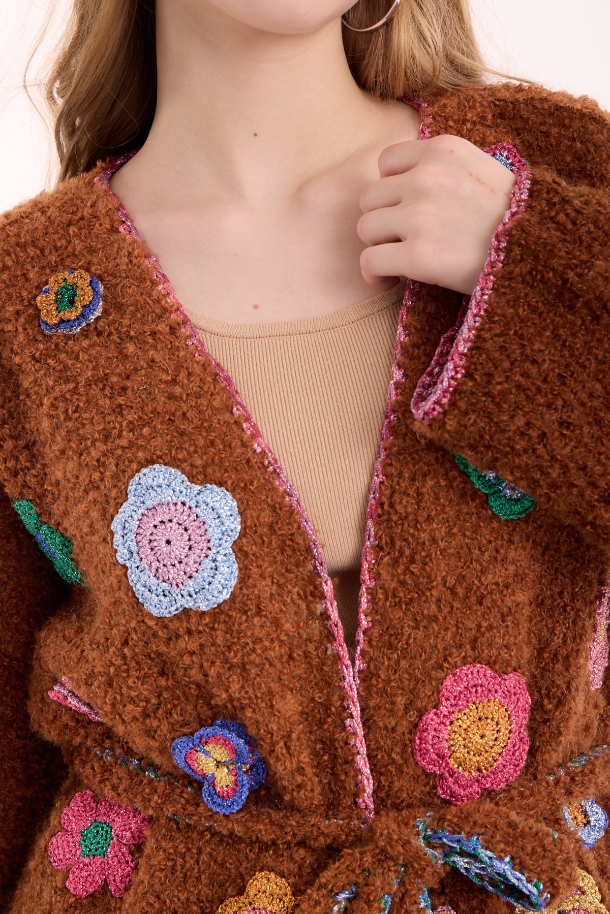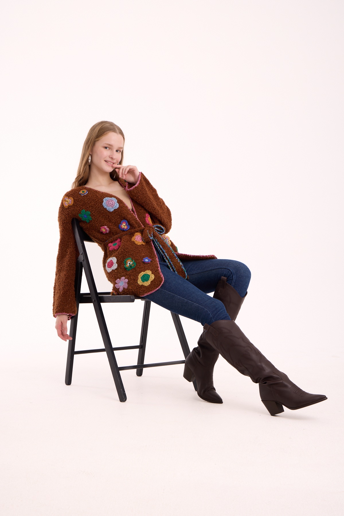 Simli iplerle titizlikle işlenen rengarenk çiçek desenleri, bu kimono hırkayı sıradanlıktan uzaklaştırıp, gerçek bir sanat eserine dönüştürüyor. Her bir çiçek özenle tığ işi ile hırkaya işlenmiş ve hırkaya canlı bir dokunuş katmış.