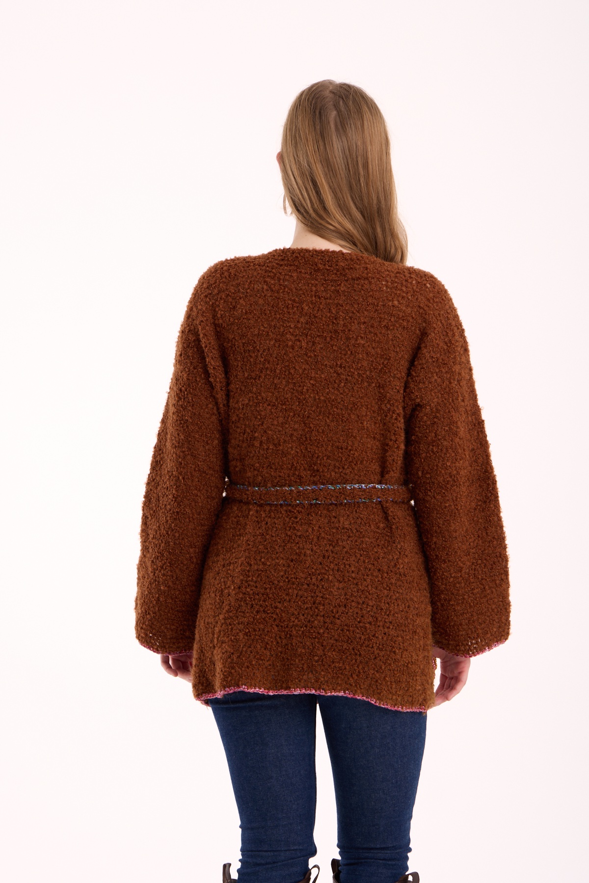 Bu özel tasarım kahverengi kimono hırkamız, soğuk günlerde stilinizi konuşturacak. Dikkatle seçilmiş üst kalite alpaca iplerle örülmüş bu hırka, size sadece sıcaklık değil, aynı zamanda rahatlık ve şıklık da sunuyor. Alpaca ipin yumuşak dokunuşu, hafifliği ve sıcak tutma özellikleri, bu hırkayı kış aylarınızın vazgeçilmezi yapacak.